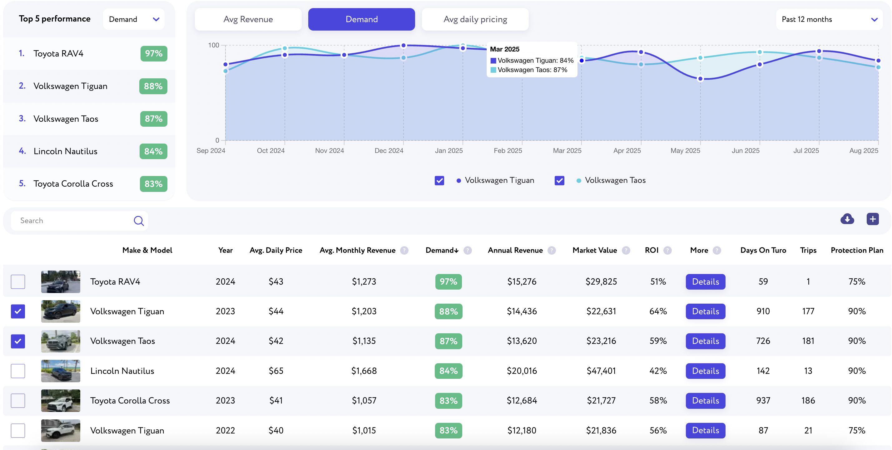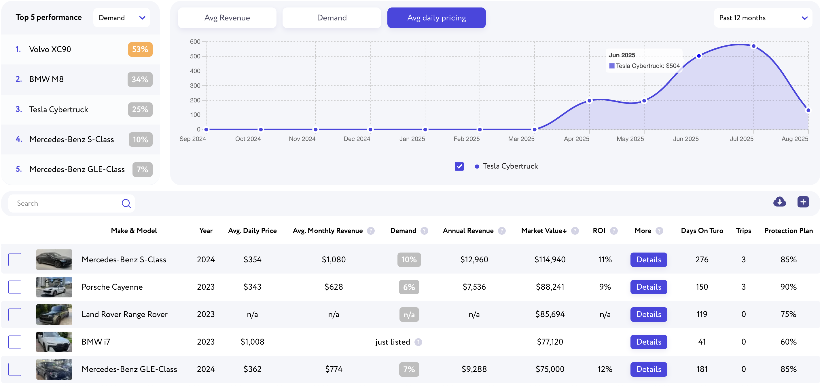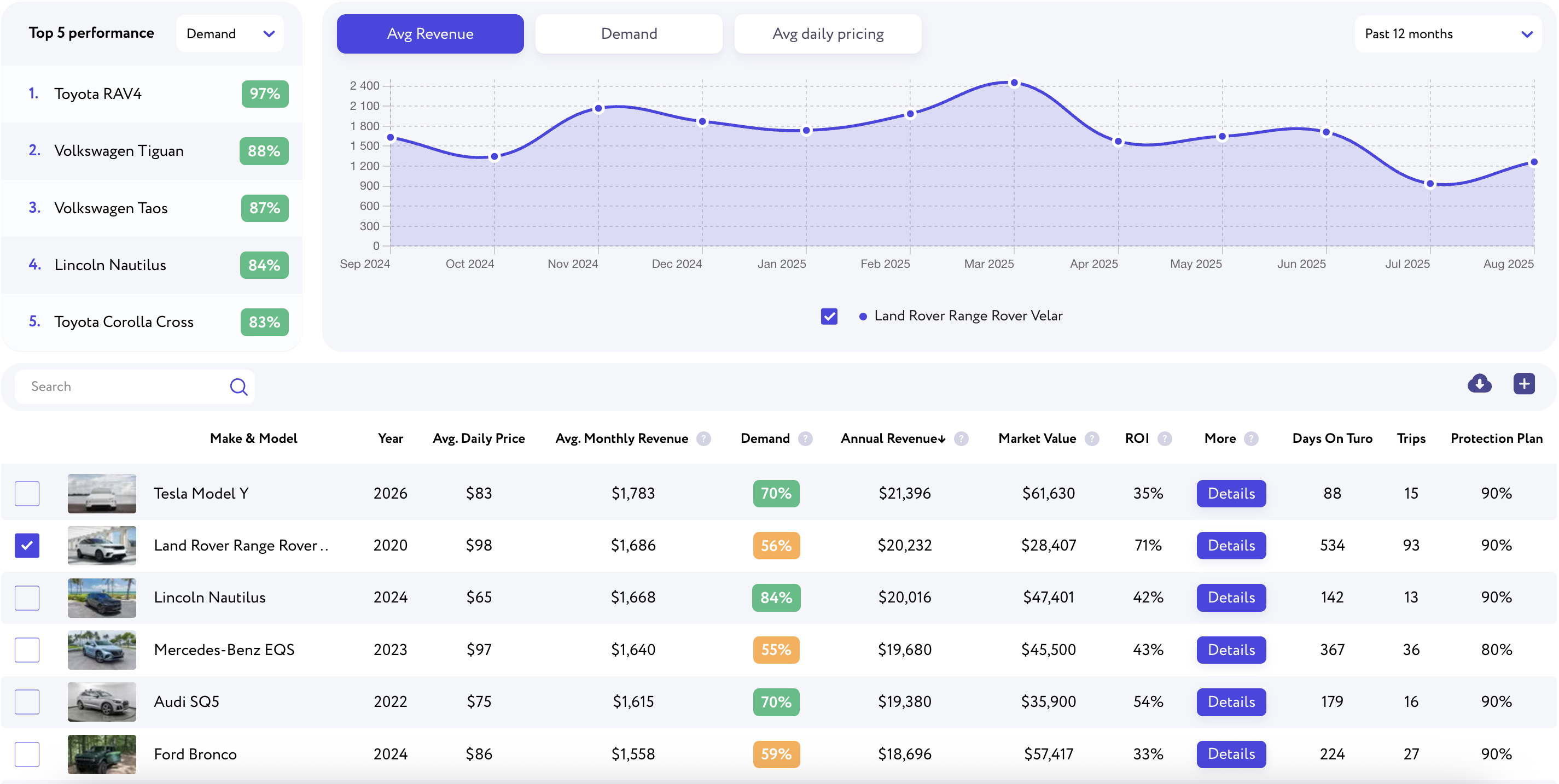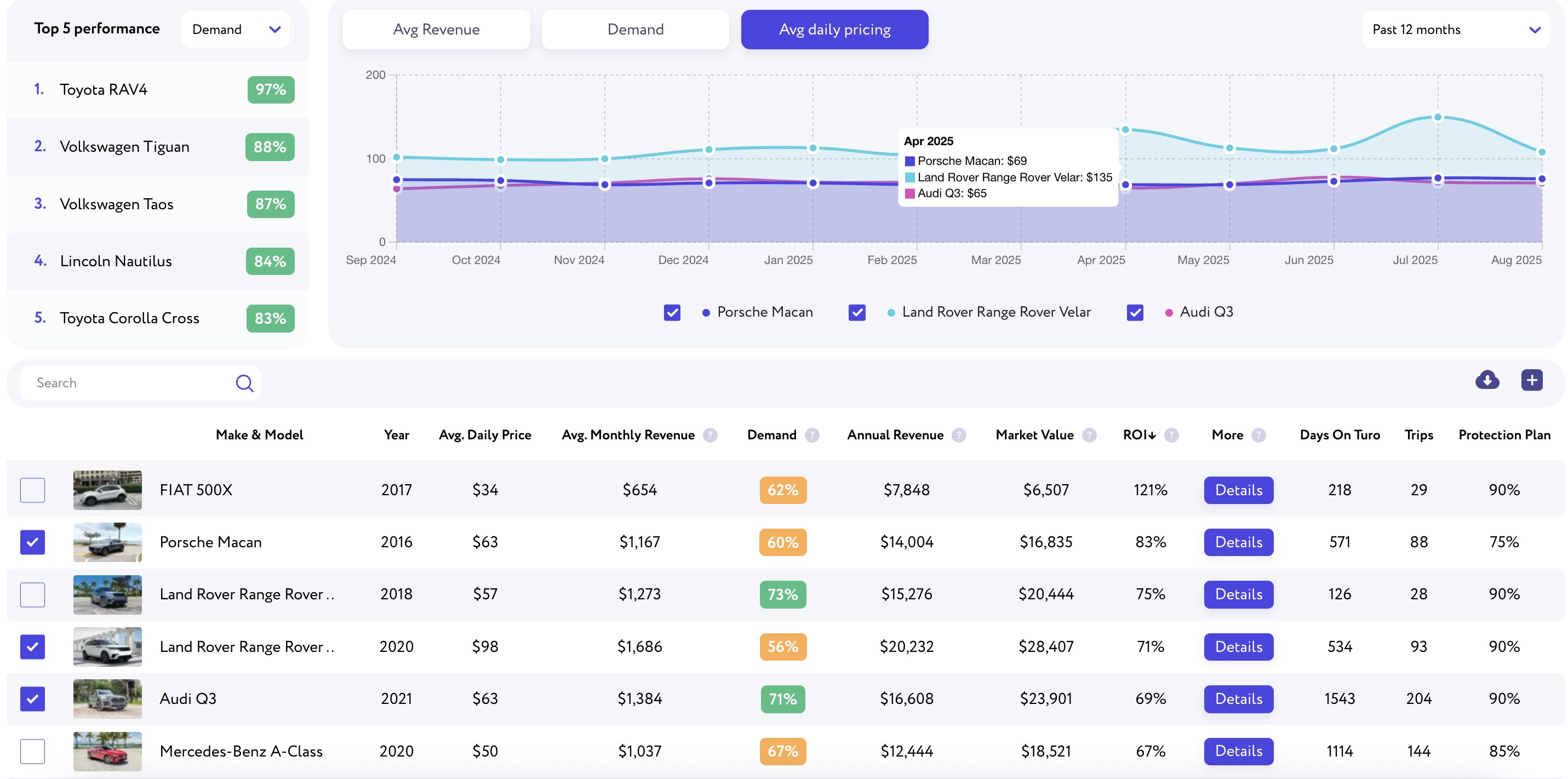 Understanding a car’s current market value and typical daily rental price helps position your fleet competitively.